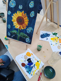 We had a great time at our last "Sip & Paint" event here at Nook. Guests laughed, danced, painted and enjoyed... best part is they all let go, destressed and painted their hearts out! Creating along side Amelia with her step by step guidance as she helped them all paint their own version of a Van Gogh Sunflower.